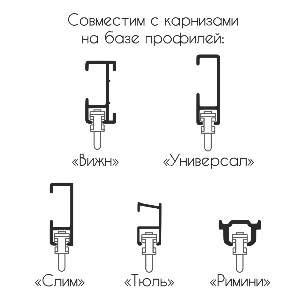 Предназначены для профилей с шириной паза ≈ 3,5 - 4 мм — профиль «Универсал», профиль "Вижн", профиль «Тюль», профиль «Римини». Чтобы корректно подобрать бегунок именно к вашему профилю, внимательно ознакомьтесь с размерами бегунка на чертеже в карточке товара.