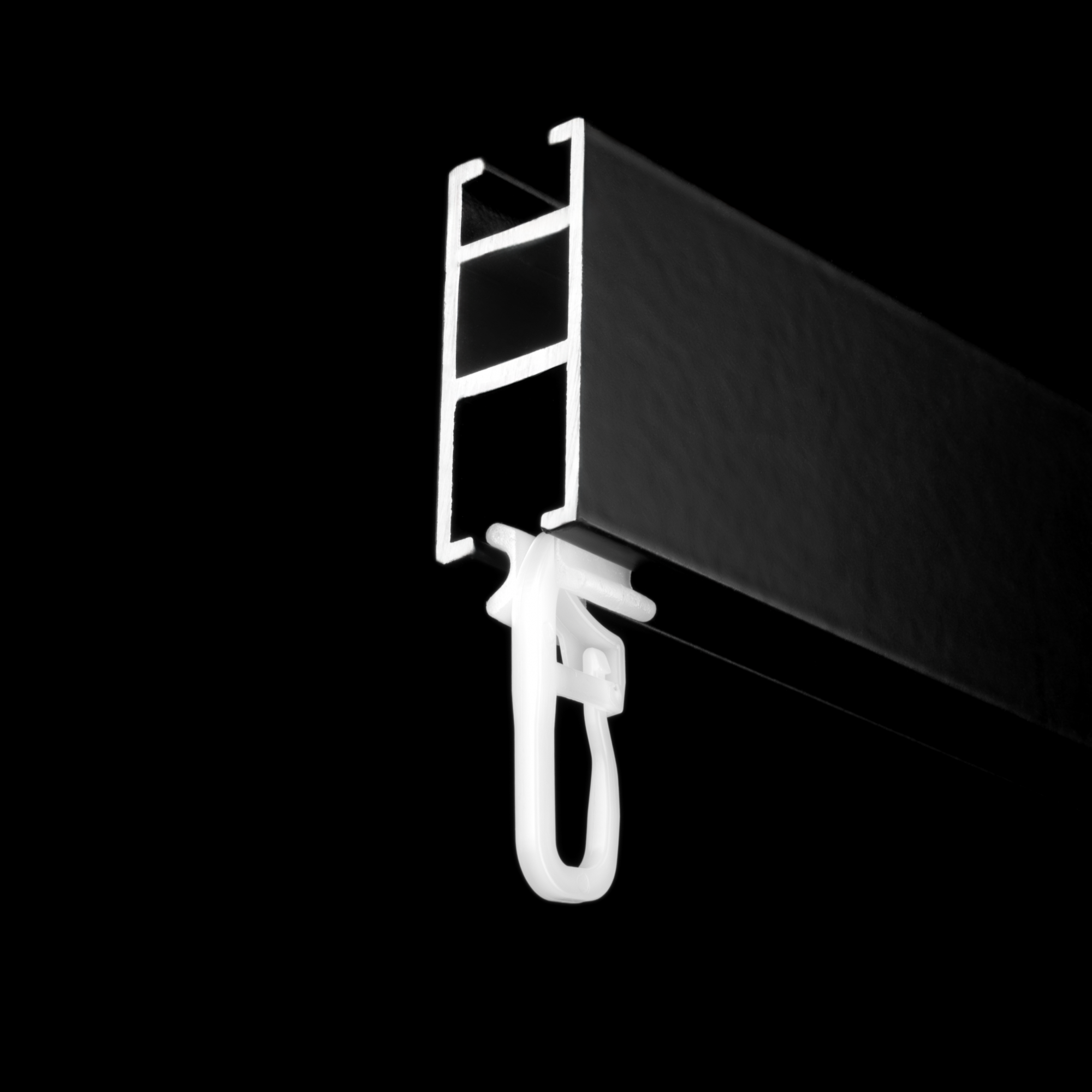 Бегунок Х-образной формы легко помещается в паз рабочей дорожки и передвигается по металлическому профилю свободно и бесшумно.