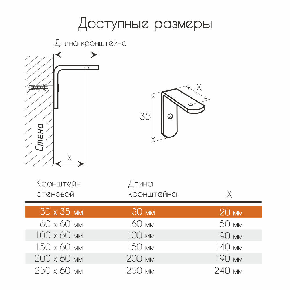 Длина основания части кронштейна, предназначенной для монтажа на стене - 35 мм. (см. схему);