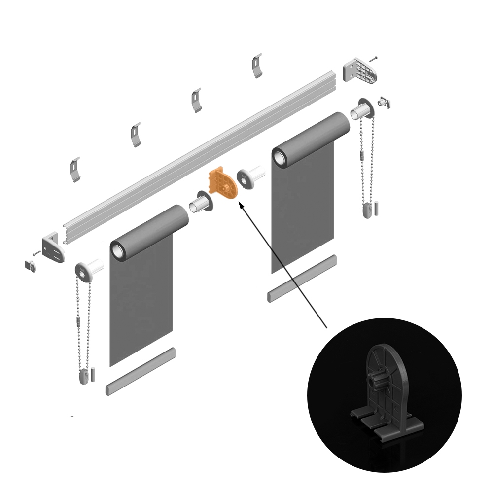 Кронштейн соединяет 2 трубы рулонных штор Ø25 мм в единую систему. Для этого необходимо расположить его между двумя рулонами штор.