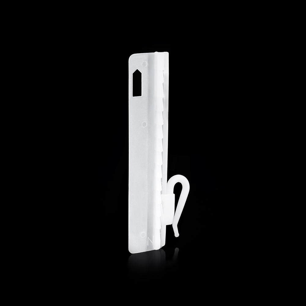 Регулируемый пришивной крючок длиной 75 мм предназначен для создания и фиксации любого вида складок на шторном полотне, а также регулирования высоты подъёма штор.