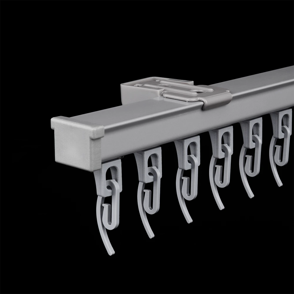 Дополнительное преимущество карниза – возможность вставлять в профиль специальные бегунки с крючками, не снимая сам карниз. Это делает размещение занавесок более удобным и простым.