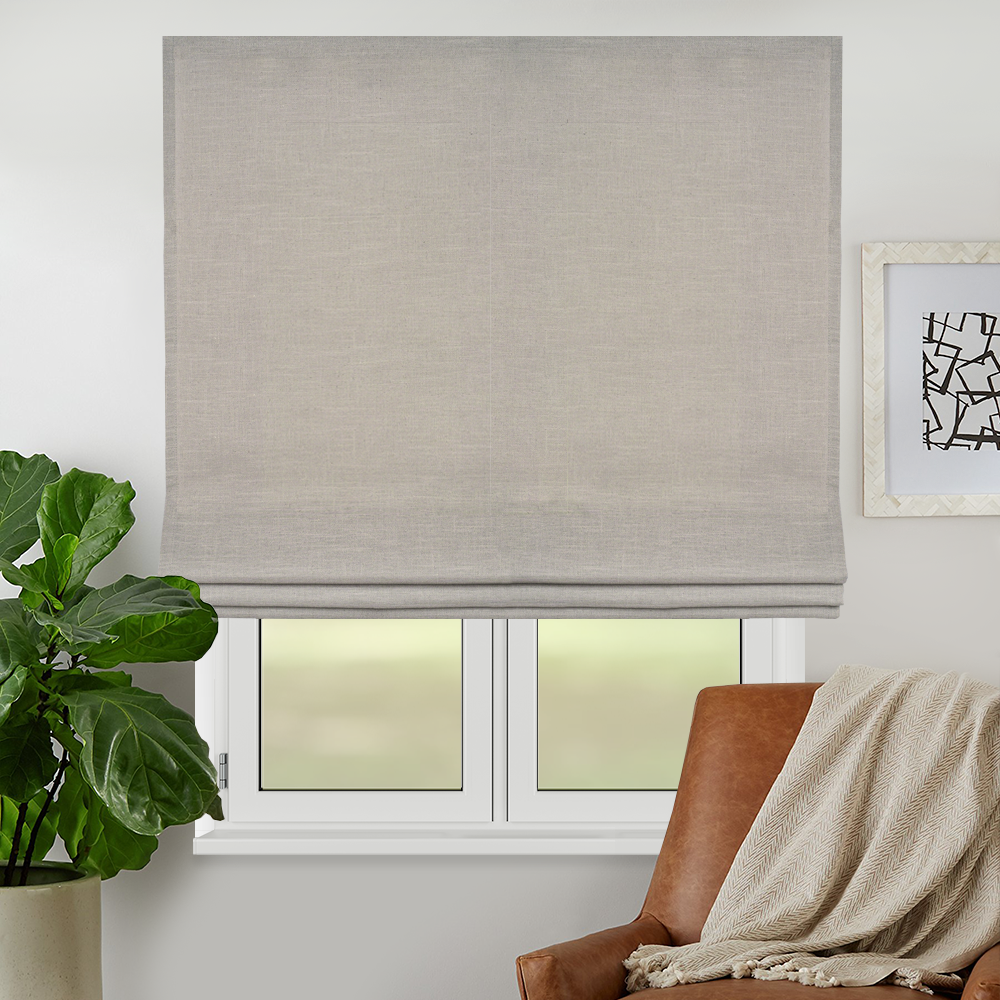Ткань римской шторы – комбинированная, напоминающая натуральный лен, но за счет имеющихся синтетических волокон в составе материала, ткань не выгорает на солнце, в отличие от натурального льна, не вытягивается и не дает усадку при стирке, не деформируется и не скатывается, что позволяет ей долго сохранять свой первоначальный вид.