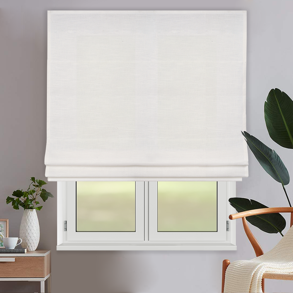 Ткань римской шторы – комбинированная, напоминающая натуральный лен, но за счет имеющихся синтетических волокон в составе материала, ткань не выгорает на солнце, в отличие от натурального льна, не вытягивается и не дает усадку при стирке, не деформируется и не скатывается, что позволяет ей долго сохранять свой первоначальный вид.
