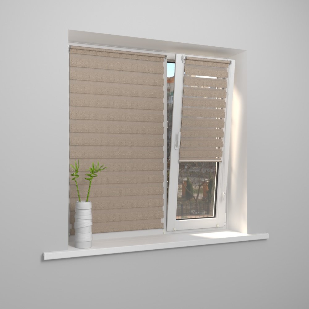 Готовые рулонные шторы на окна модели «Мини день-ночь» – это два тканных полотна с прозрачными и полупрозрачными полосами, которые чередуются с равным интервалом. При подъёме и опускании шторы полосы на ткани смещаются относительно друг друга, что приводит к изменению светопроницаемости.