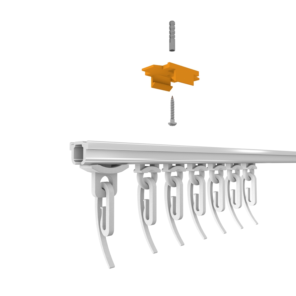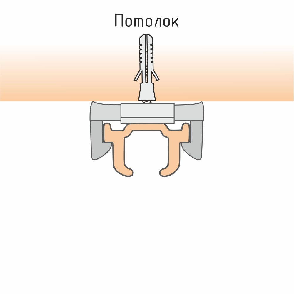 Изделие крепится через технологическое отверстие к потолку (используются дюбель и саморез) либо к кронштейну (применяется винт М 4х6 мм). Затем профиль посредством пазов на верхней плоскости вставляется в зафиксированный суппорт.