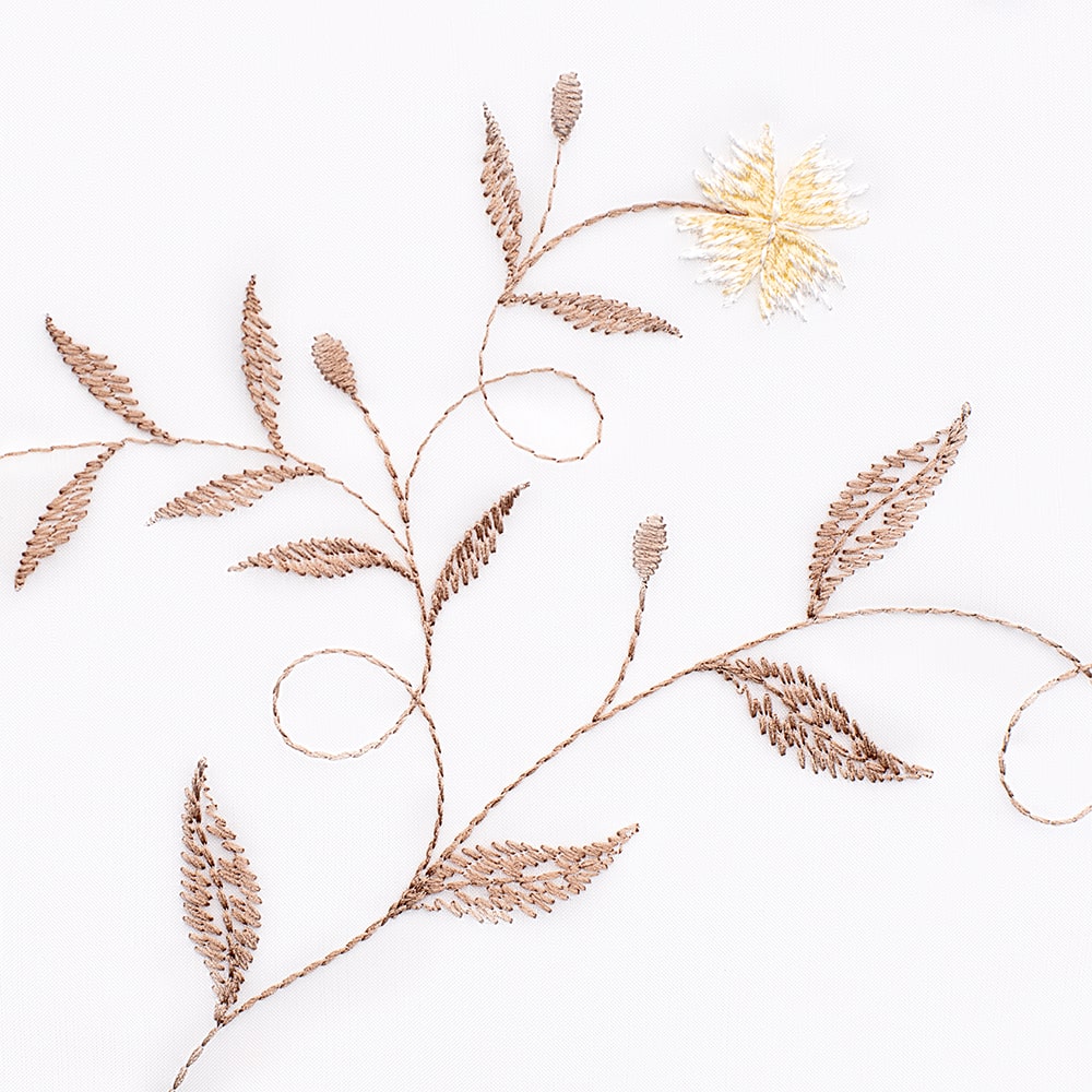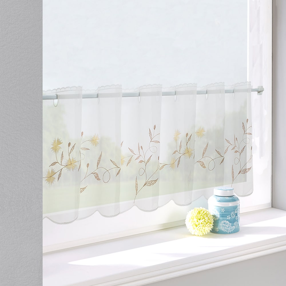 Ткань для штор-кафе коллекции «Romantik» – это нежная композиция в виде летних полевых цветов васильков на легкой и прозрачной белой ткани. Набивная вышивка ручной работы выполнена в нежнейших пастельных оттенках: стебли и листья васильков бежевые с желтыми васильками.